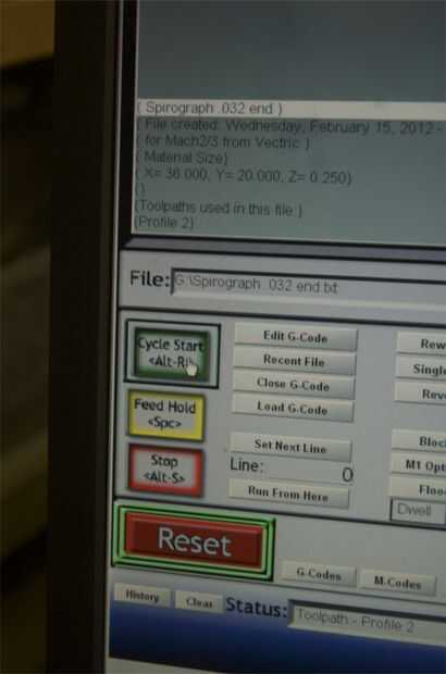 Es finalmente hora de encender el router y empezar la secuencia de corte de Mach3. Al igual que su madre solía decir "no olvides tus guantes", recuerda la materia de seguridad. Encienda el router primero. Haga clic en el botón verde en la pantalla con la etiqueta de inicio de ciclo. Está apagado y corte. ¡ sí! Si lo saca en algún extraño sentido, estar dispuestos a cerrar haciendo clic en el botón de parada. Recordar el Adagio que computadoras, (junto con máquinas peligrosas conectadas a ellos) solamente lo que les dices que hacer, no lo que tu quieres hacer. Si todo va bien, solo ver y disfrutar el momento. Para mí, esto es increíble, he usado a mano corte todos estos proyectos. Es un mundo maravilloso!