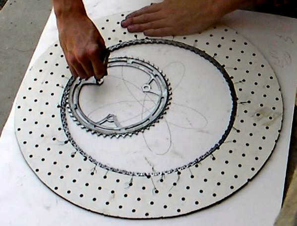 El procedimiento es el mismo que usando un espirógrafo normal. Acaba de poner el lápiz en uno de los agujeros de perno, pulsa hacia fuera hacia la cadena y trace suavemente alrededor hasta volver al comienzo.