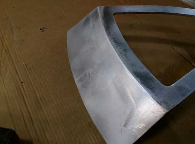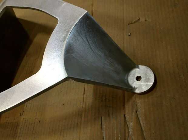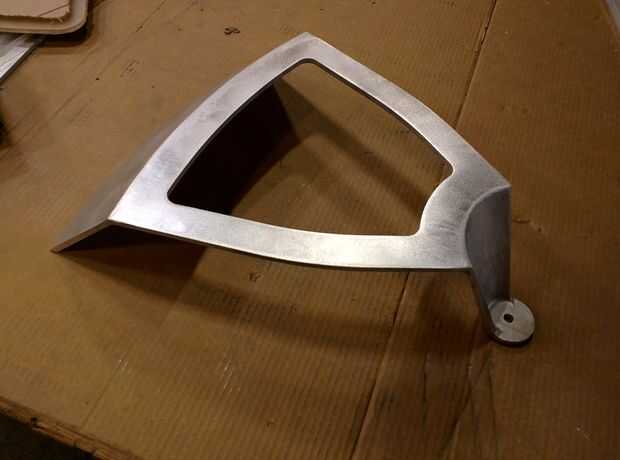 Aunque tecnologías como spinning podría acomodar el arco en forma de cuña en la parte exterior del brazo, estas tecnologías no funcionaría para la sección cónica interna. En cambio, esta pieza fue de una sección de centro enrutado y empalmada juntos de 4 otras secciones molidos. 4 secciones tuvieron que ser utilizado para cumplir los requisitos de la cama de molino en nuestro contratista de fresado CNC. Las piezas de aluminio fueron entonces soldado con autógena y mezclan en casa para hacer esta parte parecen una sola pieza de aluminio fundido de precisión.