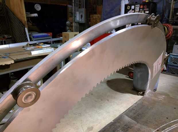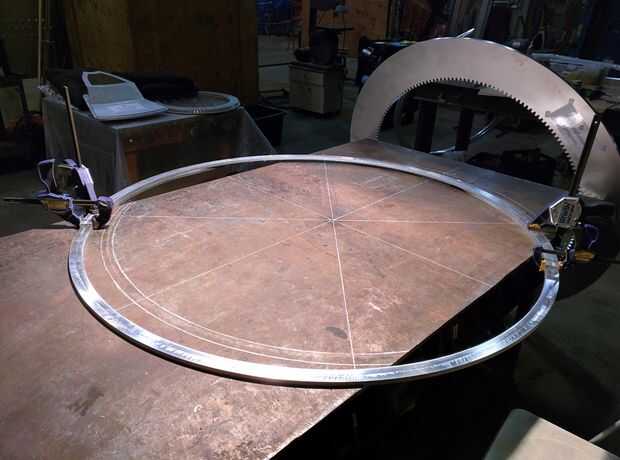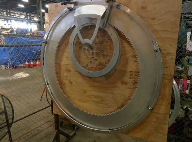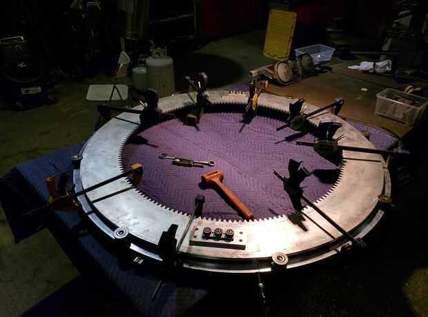 Hemos intentado resolver este problema mediante el uso de un conjunto adicional de ruedas entre el equipo de guía y equipo de dibujo. Aunque esto fue capaz de mantener la rueda externa firmemente en su lugar, esto produjo un poco de fricción y ruido en el diseño final. En vez de este concepto, hemos decidido construir un masiva 5' diámetro del cojinete de las ruedas de rodillos industriales que abarcan todo el perímetro del engranaje Guía, eliminando así la necesidad de que las ruedas más pequeñas en el diseño original.