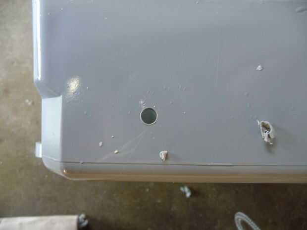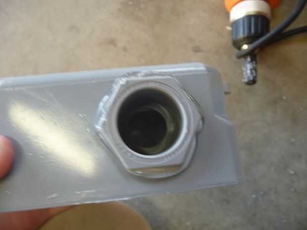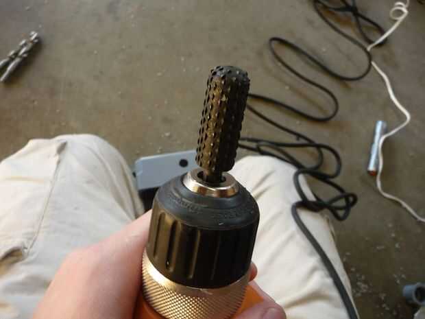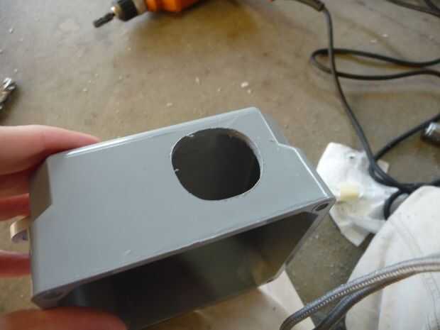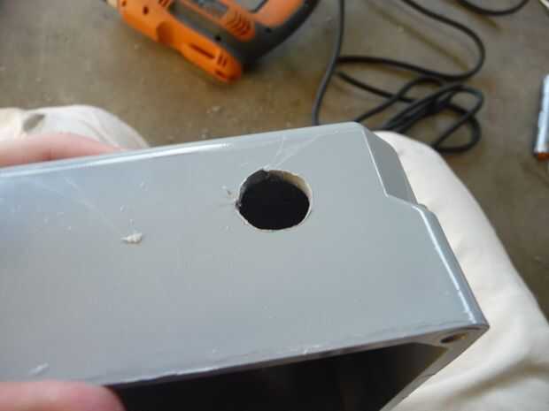 Seguir utilizando brocas más grandes hasta que esté bastante cerca del tamaño del adaptador. A partir de ahí, utilizar el raspador giratorio para afeitar hacia abajo los bordes del agujero hasta que el adaptador encaje perfectamente - lo que le permite caer en, pero el borde abocinado debe retener el caso. A partir de ahí, se puede colocar pegamento caliente a lo largo del borde presionado, lo que descarga.