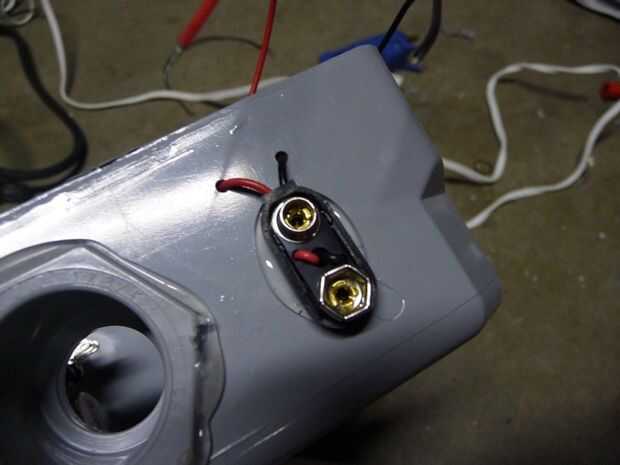 Un conector de poder de 9v, perfore dos agujeros pequeños para los cables positivos y negativos entrar en la caja, ponlo a través de ellos y pegamento caliente hacia abajo. Un cuadro a continuación ilustra lo que quiero decir.