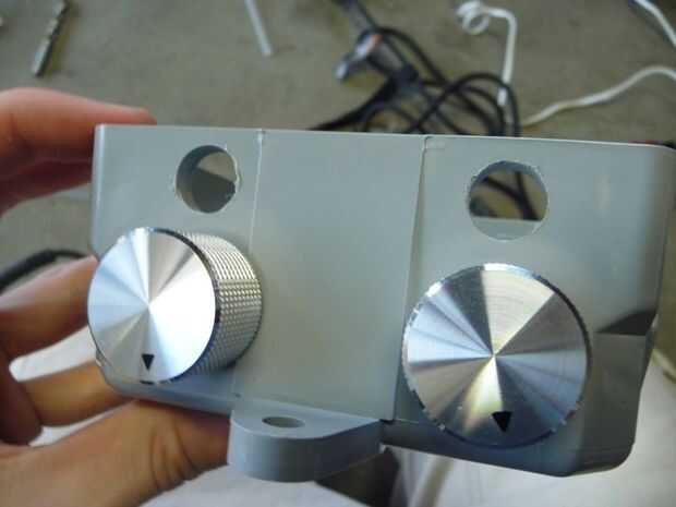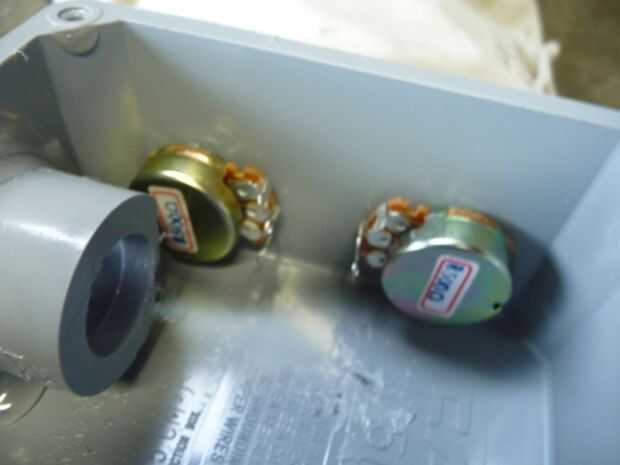 Agujero cada potenciómetro 1/2" de la base de la caja de conductos a través de un panel lateral (ver fotos). Hilo, alinear sus terminales hacia el centro y apriete la tuerca hexagonal.