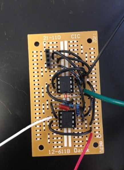 Terminal de salida de este amplificador operacional se conecta luego a un resistor de 1kOhm que va en el negativo de entrada terminal de un amp op de TL071CP. Entonces es una resistencia de valor 100kOhms en paralelo con un condensador de 100nF va desde la misma terminal de entrada negativo a la terminal de salida del amplificador operacional. Se trata entonces de la señal final que se lee en Labview.