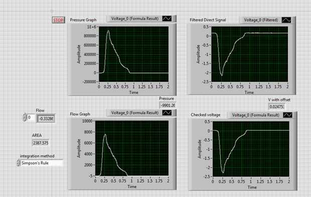 Ahora las ecuaciones que utilizamos en LabView no son perfectas como son. Desde que usamos pantimedias, hay miles de pequeños orificios a lo largo de la media. Por lo tanto no podemos calcular un valor concreto de la "L" que es necesario en la ecuación de Hagen Poiseuille. Por lo tanto, tenemos que calibrar el sistema usando un medidor de flujo que compramos en la tienda local del dólar. Mide el flujo de aire máximo de un soplo y luego lo comparó con el valor que obtuvimos de una respiración comparable en LabView. Desde allí, se encontraron valores de L para hacer los flujos de expiración máxima coinciden. En el caso de la foto, fue un duro vencimiento (pero no uno máximo) que dio lugar a un pico de alrededor de 7500 ml/seg.