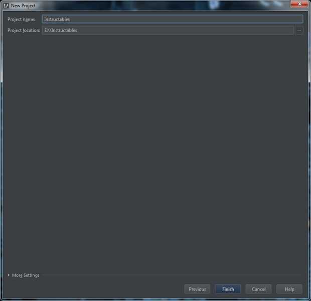 Haga clic en siguiente otra vez y nombre de su proyecto. A nombre de mina "Instructables". Usted puede ir al cuadro de texto justo debajo de él para seleccionar una ruta para su proyecto. Tengo todos mis proyectos en mi unidad de codificación, E:\, es donde esta vaya. Haga clic en siguiente y debe ser recibido con una ventana más grande.