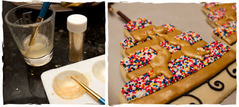 Establecer las cookies a un lado para dejar que el hielo seco hasta pasar al siguiente paso (por lo menos 20 minutos). Mezcle una pequeña cantidad de polvo de oro brillo con unas gotas de vodka o extracto a base de alcohol (no agua). Pintar la pasta de oro que se produce en las capas de oro de glaseado real.