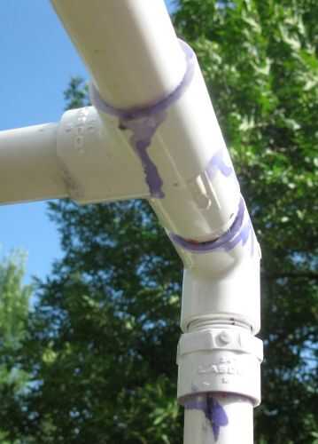 Además, aquí es donde entra mi improvisación de gran diseño. Los codos se roscan en el extremo que va hacia la pierna. La pierna, que hablaré a continuación, se remata con un adaptador a rosca. Eso significa que puede aflojar las piernas y almacenar planos para el invierno (suponiendo que tiene uno!). Esta cosa es una bestia para moverse y allí es que justo ninguna manera nos podríamos tengamos dentro si no fuera por la capacidad de aflojar las piernas.