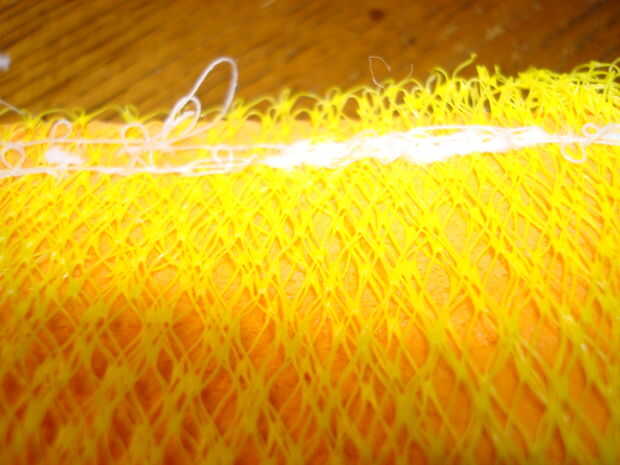 Ahora vamos a coserlo. Coser un dobladillo estrecho todo el camino alrededor del borde exterior de la esponja. Clip de hilos sueltos.