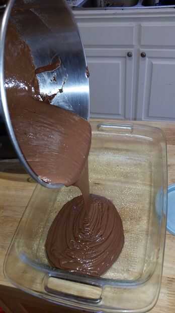 8. Vierta su mezcla en el molde que preparaste y ponerlo en el horno. Siga la guía de tiempo que se da en la caja, según la olla o cacerolas que utilizas. Empiezo a comprobar mis pocos minutos antes del tiempo mínimo, pero eso es principalmente debido a la paranoia para hornear. Comprobar con un palillo de dientes (cuando el palillo sale limpio, está hecho).