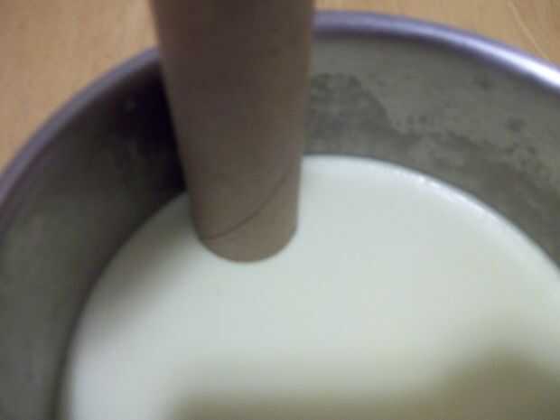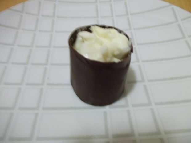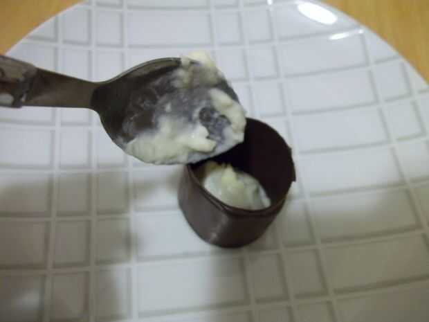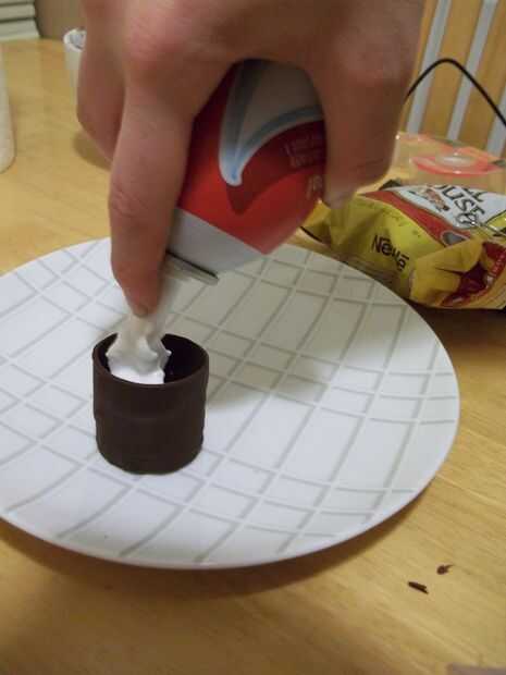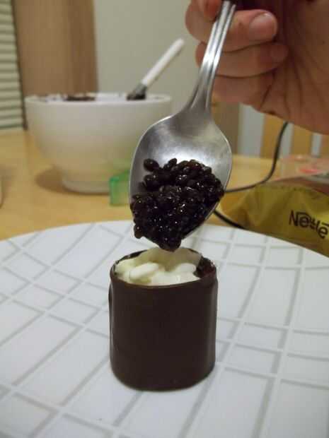 - Vierta su panna cotta en el cilindro de chocolate (o si fuiste la ruta vagos, chorros algunos crema batida allí) hasta que el cilindro está casi completo.