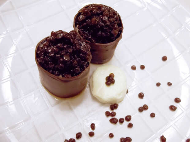 - Si quieres alguna decoración de placa, puede usar su forma de cilindro de cartón para perforar los discos pequeños de panna cotta y luego esparcir algunas huevas extras alrededor de. O lluvia de chocolate alrededor. Que se vea bonito.