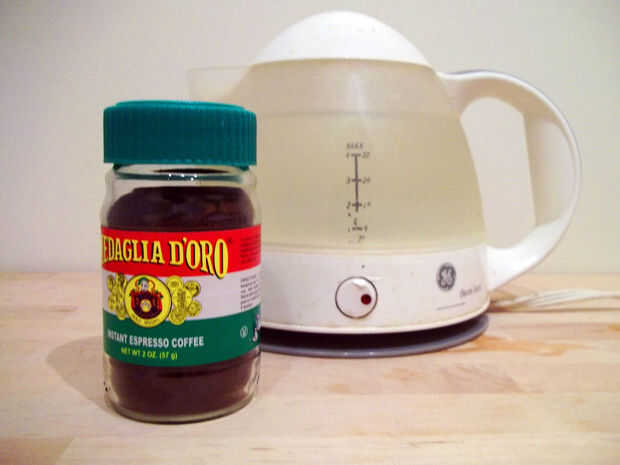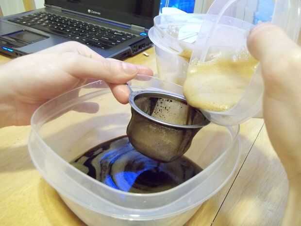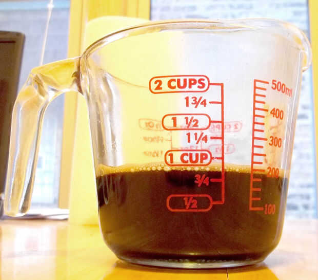 Utiliza un espresso en polvo para esta receta y preparó un poco más fuerte que lo que dictan las instrucciones. Recuerda que estas esferas de caviar de café serán pequeñas-querrá que suponen un aporte de sabor que usted notará en pocos caviar "gotas". En mi caso, el café fue un poco amargo, así que añadido 3 cucharaditas de azúcar. Se puede sustituir el café fresco, o jugos de fruta incluso fuertemente condimentado - sólo ten cuidado con la acidez, como algo demasiado ácido producirá la reacción.