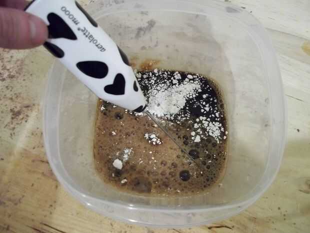- Mezclar bien. He utilizado una espuma de leche, pero puede utilizar cualquier cosa te gusta-una batidora de mano o un batidor hará muy bien. La solución será bastante espumosa - no te preocupes.