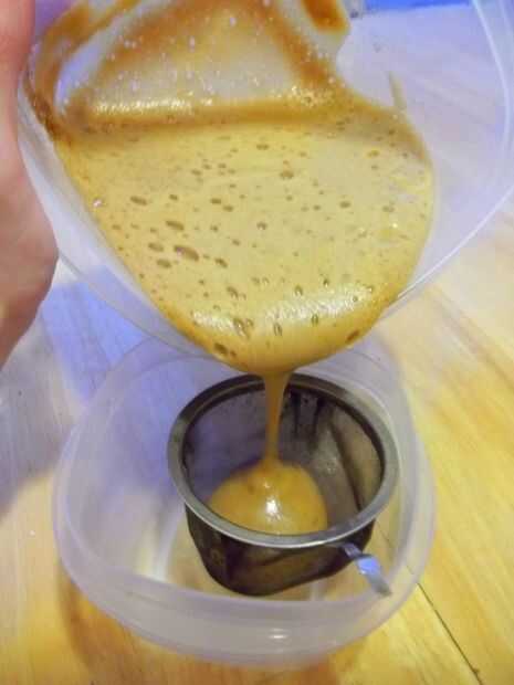 - Pasar por un colador de malla fina un par de veces y deje reposar en la nevera hasta que la espuma se ha disipado. Deseche cualquier grumos que puedan haber quedado, esto puede ser debido al agua dura, o contaminación cruzada. Alginato de sodio es sensible al calcio.