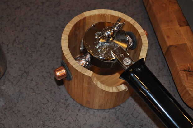 Corte el tubo claro entre los dos ojales. Deslice el tubo a través de anuncios pop en los tapones. Mina presión no ajuste fino pegamento/soldder necesitada. Podría apretar ligeramente los extremos del tubo de cobre para hacer las tapas encajen firmemente. Después de meses de golpes, sin perder los casquillos aún.