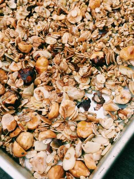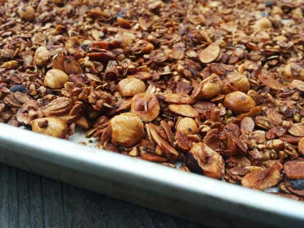 Vierta la mezcla húmeda (café, agave, aceite de coco y especias) sobre la mezcla seca (avena, trigo sarraceno y nueces). Revolver hasta que los ingredientes secos son totalmente cubiertos; luego Vierta la granola en una bandeja forrada con papel sulfurizado y hornear a 350 grados Fahrenheit por 30-40 minutos, girar la cacerola y revolviendo la granola cada 10 minutos para evitar que se queme. Cuando termine, la granola será dorado, y se pondrá crujiente mientras que se refresca. Sacar del horno y deje enfriar completamente antes de revolver la granola, rompiendo cualquier grumos más grandes.