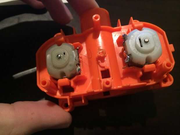 Retire los tornillos que sujetan el blaster juntos. No importa lo que les sucede que no los necesitan. Hay un cable negro que sostiene los dos lados juntos. Corte, estará cortando un montón de cables más. Ahora que está abierto, lo que necesitamos es la jaula del volante, la jaula del empuje y el sostenedor del clip. La jaula del volante parece la primera imagen, seguida de la jaula del empuje y por último el sostenedor del clip. Esta última pieza llevará a cabo el clip que estamos usando en mucho más perfectamente que cualquier cosa 3D impreso podría. Todo lo demás se puede mezclar o utilizar para otros proyectos, no lo necesitemos. También desoldar las resistencias de los motores, se utilizan para proteger a los niños, no estamos preocupados sobre eso aquí.