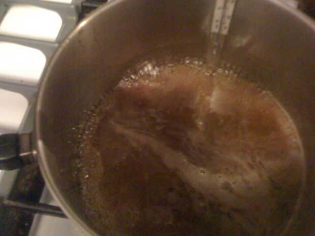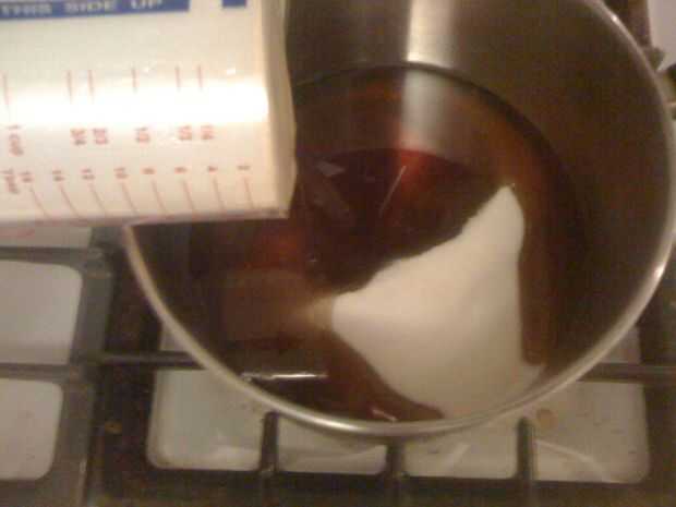 Añadir el almíbar, el azúcar y el vinagre a la cacerola y termómetro de lugar en el lado no apoye en la parte inferior.  Hubiera podido inclinar la bandeja para tomar medidas.  Calor a 300deg F.