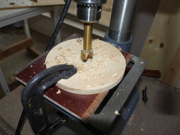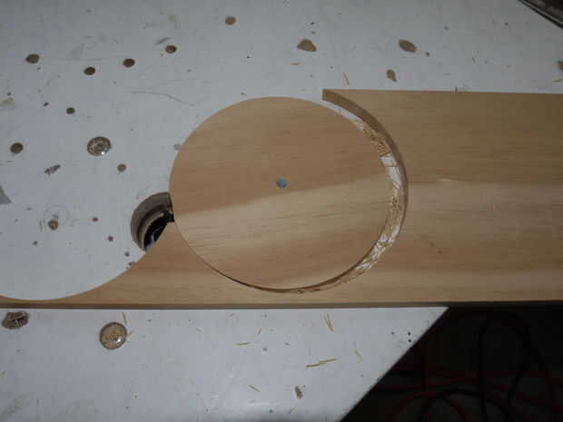 Corte de un guardia de la espada, la forma y el tamaño de su preferencia. Usé unos 3/8" espesor pino tenía por ahí y corté un círculo clavando a la mesa a través de un punto de giro y giro contra una hoja de espiral en una mesa montada fija router (yo no recomiendo mi router libre protector de la mesa de montaje, pero eso es lo que I mano; y debido a la falta de penetración, tengo que empezar justo al lado de la pieza que produce una pequeña área plana). Un cortador de círculo impulsado por un taladro funcionan bien, también. Si usted tiene un rompecabezas de buena calidad puede cortar un círculo con el, también, a mano o con una simple plantilla. Todos estos métodos dejan una marca de centro.