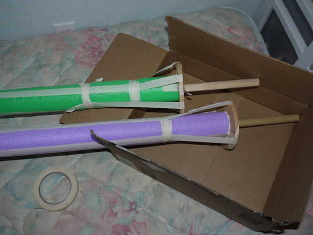 Poner pegamento por parte de la espuma hacia la guardia y asegúrese de que hay poco de pegamento en la espiga donde va la guardia, pero no demasiado. Inserte el protector. Usé cinta de pintor como abrazaderas para las espadas grandes. También había usado demasiado pegamento y fue filtrando en la guardia y tuve que limpiar continuamente.
