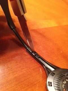 Ver el cuadro de texto. El punto del cuchillo está en un nódulo de liberación. Presione ligeramente hacia abajo y tire el altavoz de los auriculares. (Estos teléfonos son hechos por Sony y viene con un reproductor personal de CD/MP3 que utilizar). La segunda foto muestra el altavoz separado de la venda.