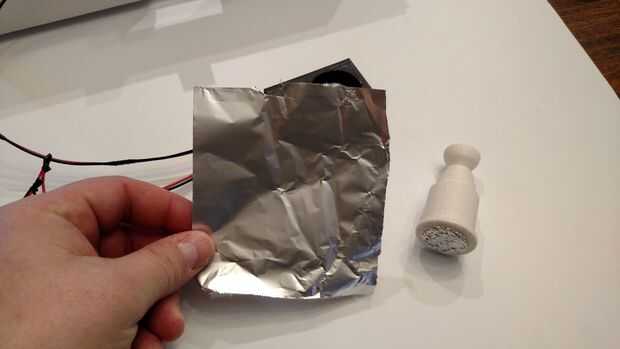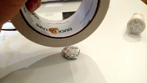 Rasgar un pedazo pequeño de papel de aluminio (100 x 100 mm) y enrollar en una bola suelta, entonces utilice un rollo de cinta adhesiva para golpear suavemente la bola plana para hacer un disco.
