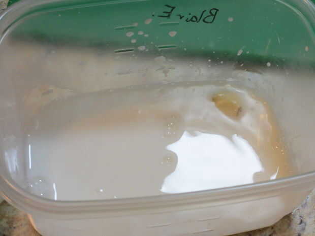 Añadir la lecitina de soja, el agua y el parmesano en un recipiente poco profundo.