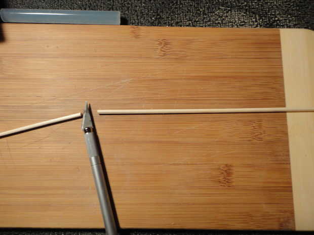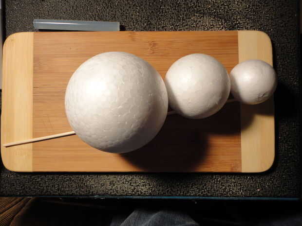 Línea de tres bolas de espuma de poliestireno en ya sea ascendente o descendente, totalmente a su elección. Sólo mentira y hacer una medida rápida con un pincho de bambú. Usted quiere su ayuda para extender un poco por debajo del muñeco de nieve, pero no queremos que salgan de la cabeza, así que una medida que al igual que las tres bolas es sobre derecho. Haga una marca, corte el pincho. Hacer esto para tantos muñecos como que estaban pensando hacer. Hicimos seis, en tres longitudes diferentes.