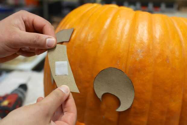 Ahora es tiempo de tallar su Jack-o-lantern. Ayuda a una plantilla de papel al frente de la calabaza de la cinta, posición de cómo os guste y luego trazan lo.