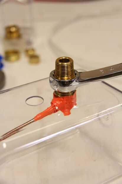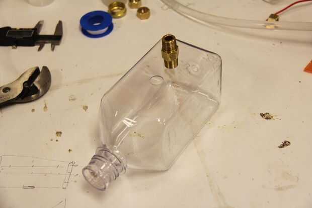 Esta parte es un poco complicada, como precaución de seguridad que tope los extremos de la válvula de retención roscada de MIP con un accesorio de compresión - una tuerca de latón de tipo que era sólo lo suficientemente pequeña como para caber a través de la boca de la botella y se atornilla en su lugar. Se utilizó una pieza de metal golpeado ligeramente en la tuerca para mantener la compresión en el lugar como la válvula de retención se atornilla para que sí mismo con rosca por.