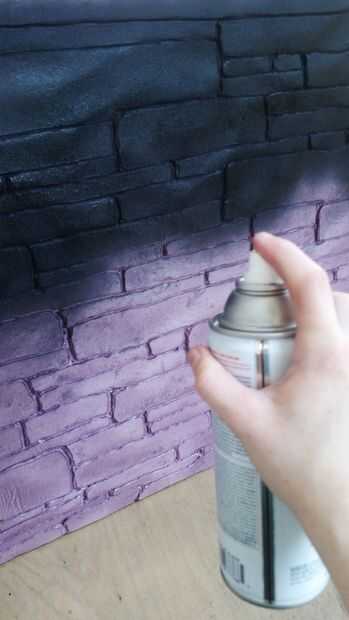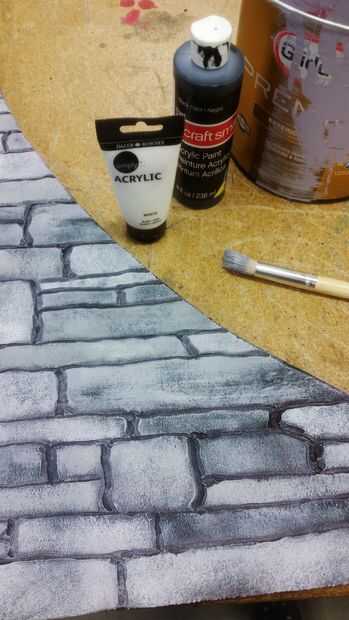 Polvo ligeramente las paredes de piedra con la pintura negra de spray del mismo modo que hicimos con las tablas. He encontrado que los bordes entre las piedras que profundizado con el soldador tomaron un poco más de atención para cubrir completamente negro.