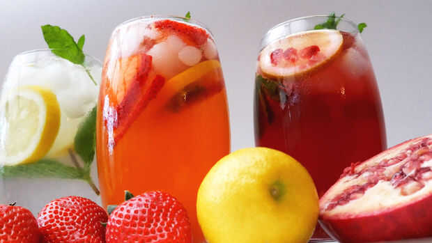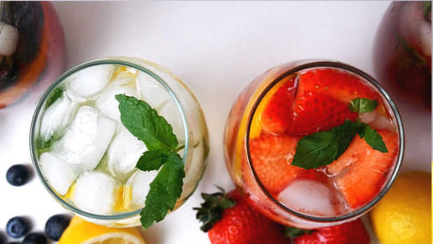 ¿Puedo tener el placer de presentar a usted tres versiones de romántico, refrescante, veraniego, lleno de baya floral limonada?Limonada de fresa-rosa de rosaLimonada de limón-saúco amarilloLimonada de arándanos-lavanda púrpuraEste proyecto fue un poc