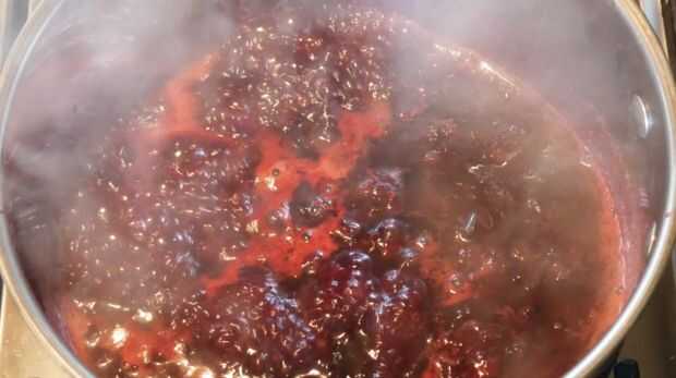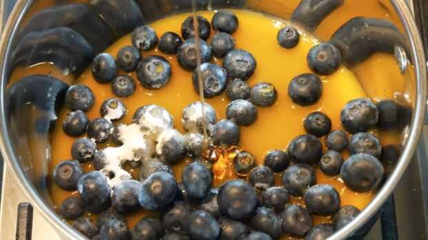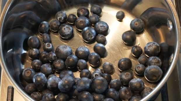 Calentar todos los ingredientes a fuego medio - bajo. Triturar los arándanos una vez ablandados y colar por un tamiz.
