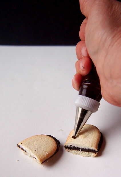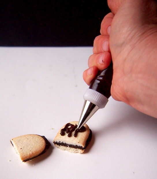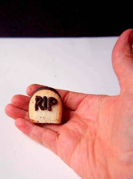 Llene una manga pastelera o una bolsa de Ziploc de congelador con glaseado de chocolate y colóquele una boquilla #3 con un acoplador (o simplemente hacer un recorte muy pequeño una esquina de la bolsa) al tubo las letras RIP en una mitad de una galleta de Milano.
