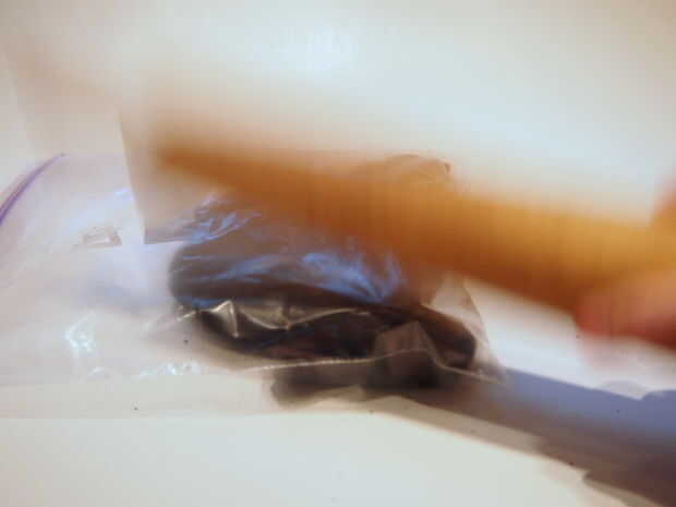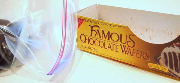 Todas las "Nabisco famosa chocolate obleas" colocar en una bolsa de Ziploc de congelador y usar un rodillo de cocina o un martillo para machacar las galletas para hacer la suciedad.