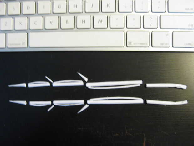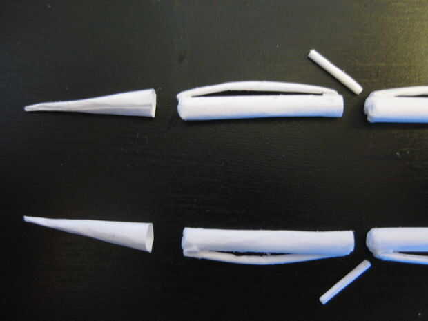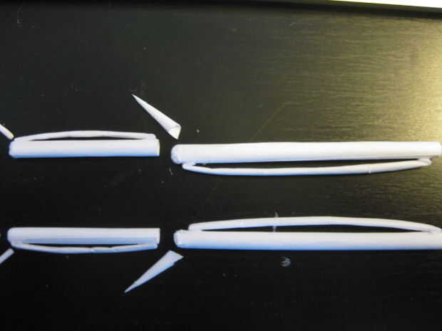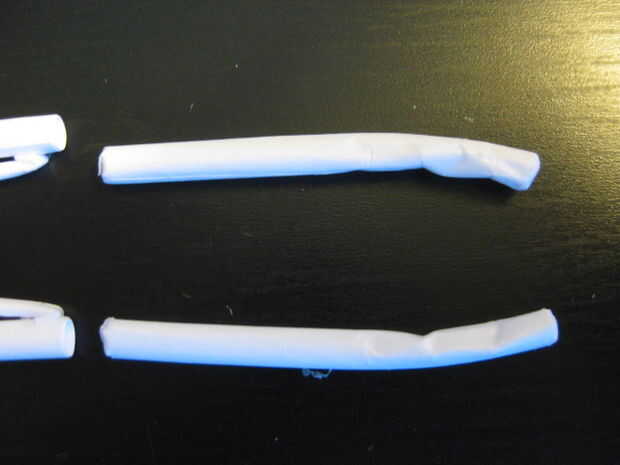 Mira las imágenes, hacer que algunos tubos. Grandes, algunas pequeñas, algunas directamente, algunos curvan. Se puede ver en la primera foto cómo se distribuirán cada ala. así como también algunos acercamientos para los huesos individuales. Nota: cada hueso es sólo un tope en un extremo y dejó abierta en el otro, esto hará que les mate muy bien durante el montaje.