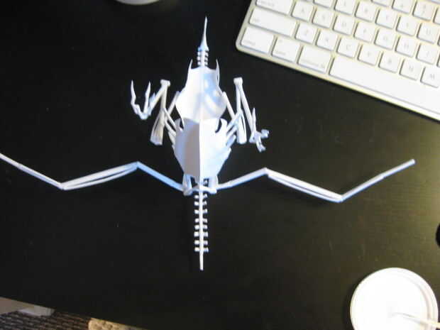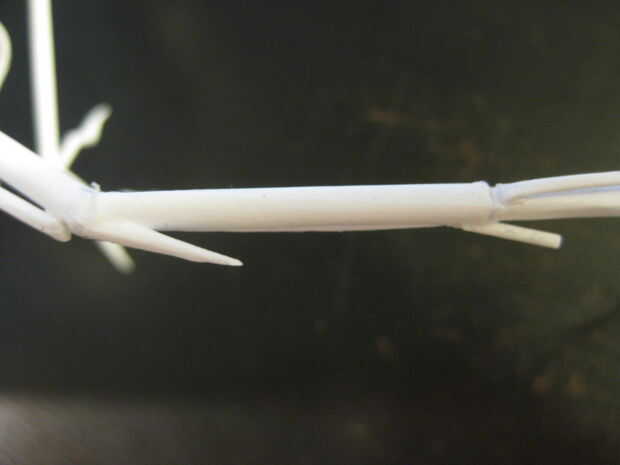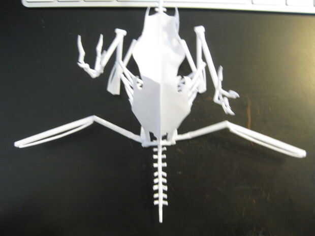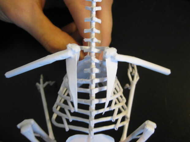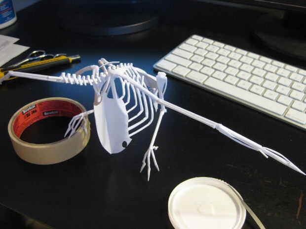 Semejantemente a las piernas, cada empalme debe estar seco antes de pegar en el hueso próximo o se deforma bajo el peso adicional y su Cuervo será desequilibrado. Me pareció bastante difícil obtener los ángulos de las juntas en cada ala simétrica, usar un montón de cinta adhesiva y si es necesario, que tu pila pequeña de pegamento seco hacia fuera hasta que ya esté pegajoso antes de aplicarlo.