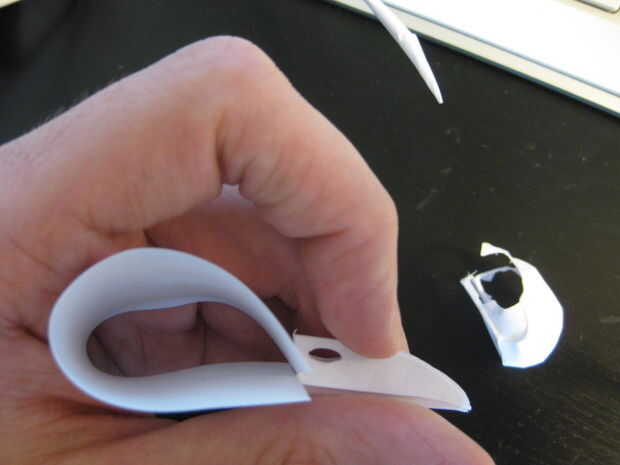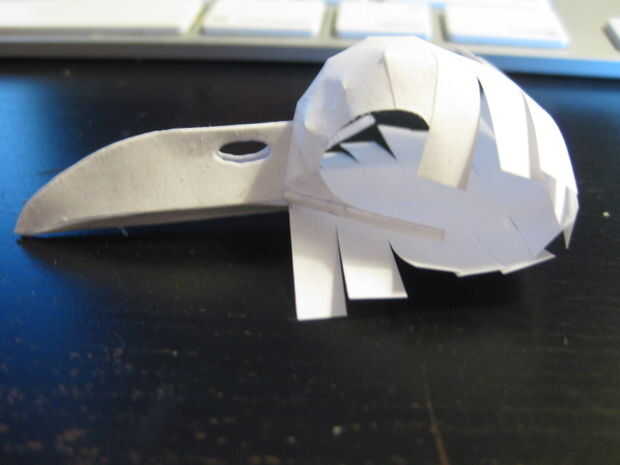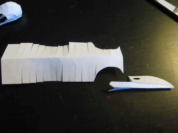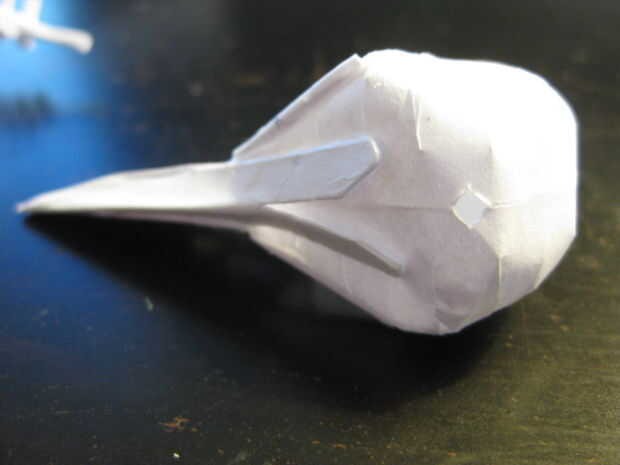 Aprendí! Es una imagen de mí medir algo. Se puede ver el cráneo aplanado en la segunda foto. Doblando encima de consistió en a partir el pico y traslapando cada sección ligeramente hasta que terminas con una calavera. Hacer un pequeño agujero en la base del cráneo para el montaje de la columna vertebral y luego pegar todo junto.