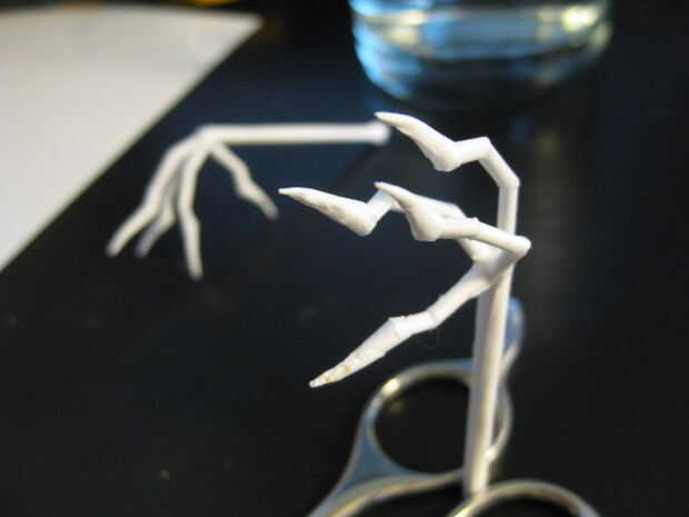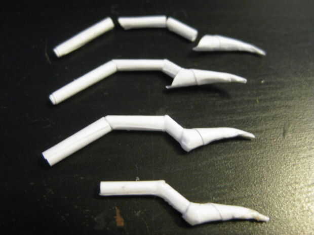 Quería empezar con el cráneo, pero no podía encontrar la manera de ir sobre ella así que me puse a los pies. Eran relativamente sencilla. Sólo hacer unos pequeños tubos, cada dígito termina siendo cerca de 2cm de largo, así que por consiguiente los tubos. Pegar los tubos pequeños en el ángulo que deseas y pega la garra en el final.