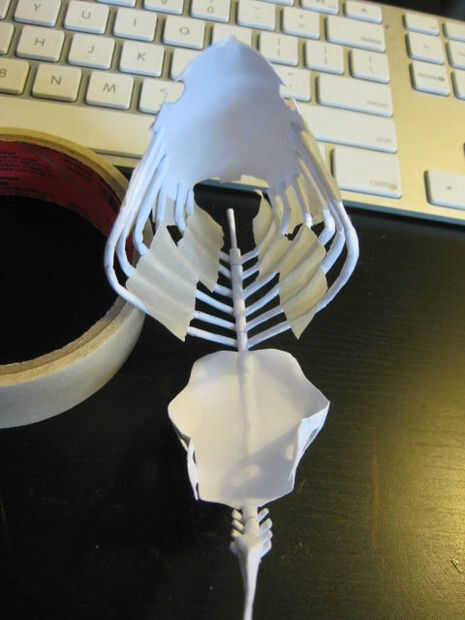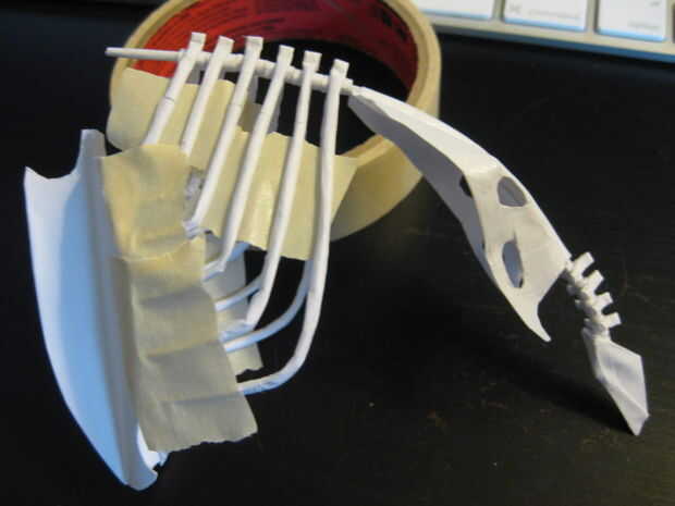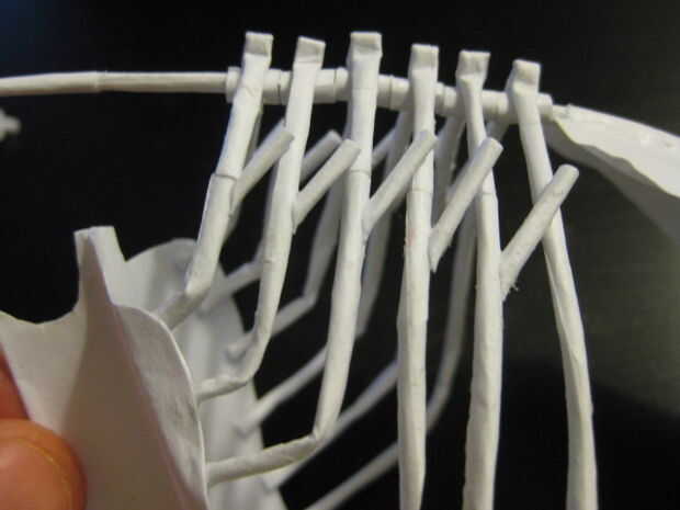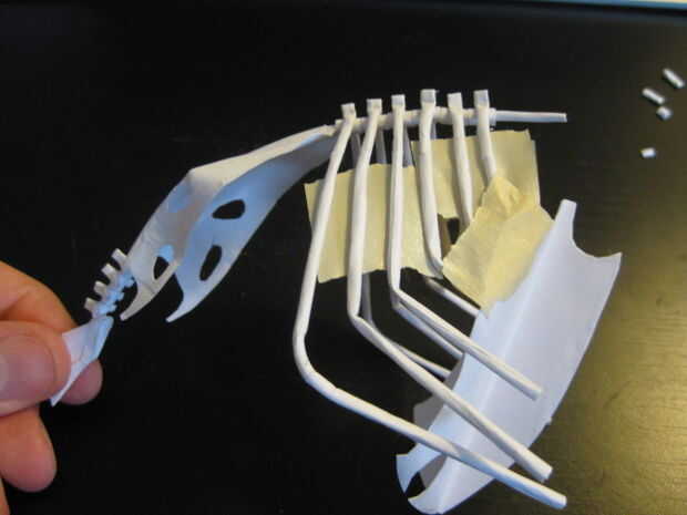 Hacer un tubo de aproximadamente 10cm y fije a la parte superior del sinsacro, luego deslice las costillas sobre la misma y encolar. Hacer las curvas apropiadas, mina fueron un poco más angular y yo quería, así que intenté volver a doblarlas sin éxito. Utilizar la cinta adhesiva y haz todas las costillas colocadas apropiadamente, luego Unte el interior del esternón con el pegamento.