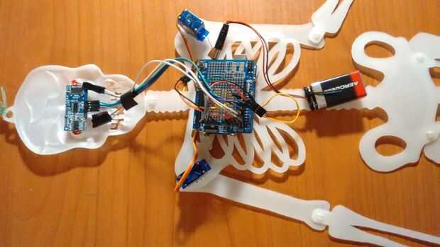 Instalar la biblioteca SRF05 (archivo "SRF05.zip") en el directorio "libraries" (o usando el IDE de Arduino), luego subo el programa de esbozo (archivo "Scheletro.ino"), coloque su ardu-esqueleto en alguna parte y usted está listo para tener un Halloween divertido con tus amigos!