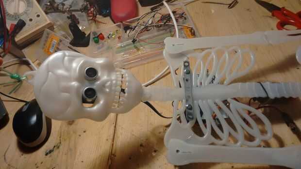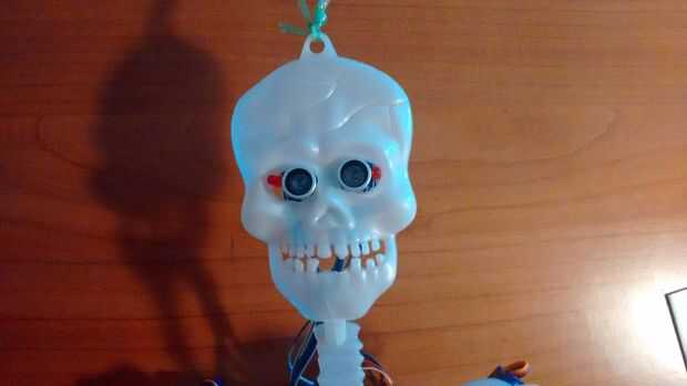Ahora toma el sensor ultrasónico (sugiero SRF05 porque SR04 más baratos son a menudo escuchas) y caber dentro de las órbitas: Esto permitirá su esqueleto "ver" si alguien está cerca de él y también hace el esqueleto un poco más "miedo" como parece ser "mirando" a usted... En mi caso utilicé un cortador dejó el sensor encajar correctamente las órbitas.