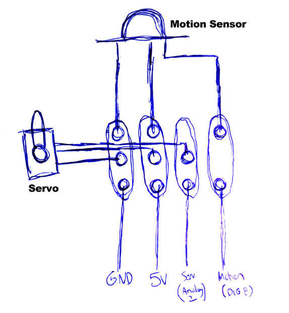 Aquí es cómo están conectados el sensor de movimiento y servos.  Estos diagramas se realizan de esta manera porque había conectado todos los cables en el cráneo hasta un tablero de circuito pequeño proyecto y entonces usa Cable de red CAT-5 para ejecutar hasta el arduino.  El cable de red me ha permitido tener más cables para ejecutar todo lo que necesitaba en un solo paquete conveniente.