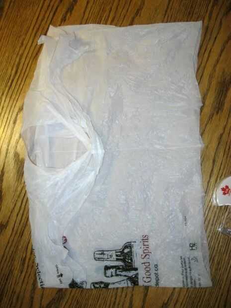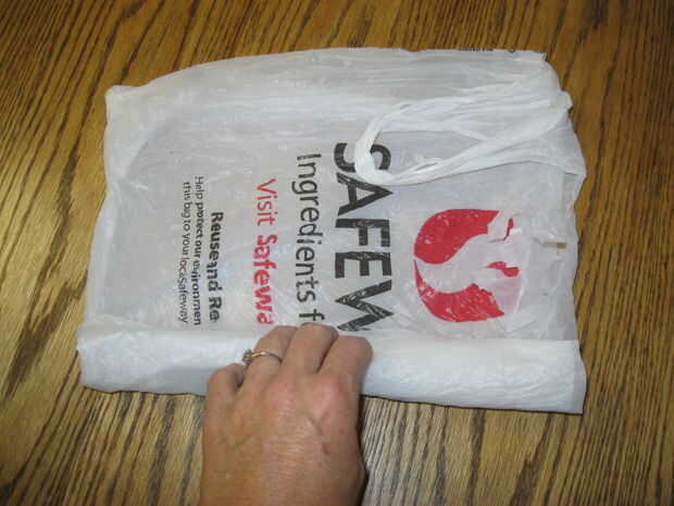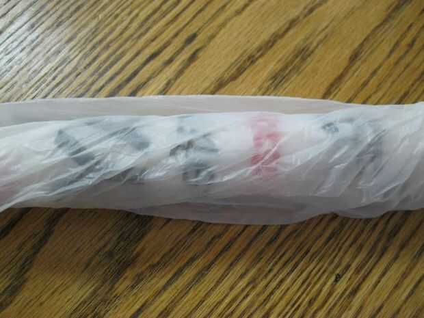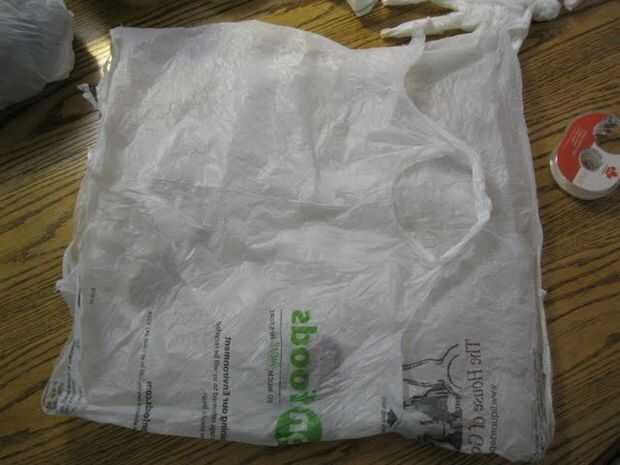 Un consejito, si tienes algún problema con el logotipo de la empresa mostrando a través de la plástica como yo lo hice, intente el método en la foto número 4. Cortar la parte inferior de la bolsa. Volver a aplanar la bolsa con la escritura en la parte inferior de la bolsa. De esta manera cuando se ruede para arriba, la impresión es medida dentro del cilindro como sea posible.