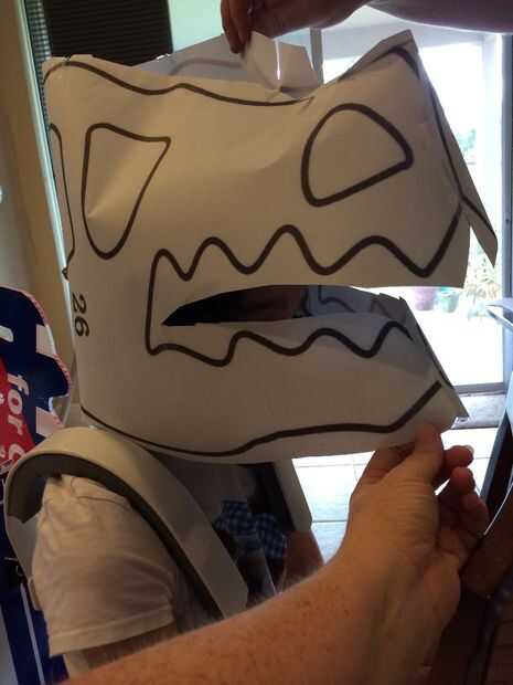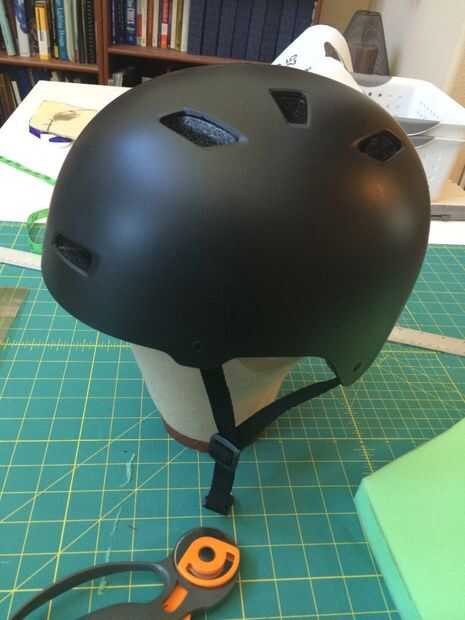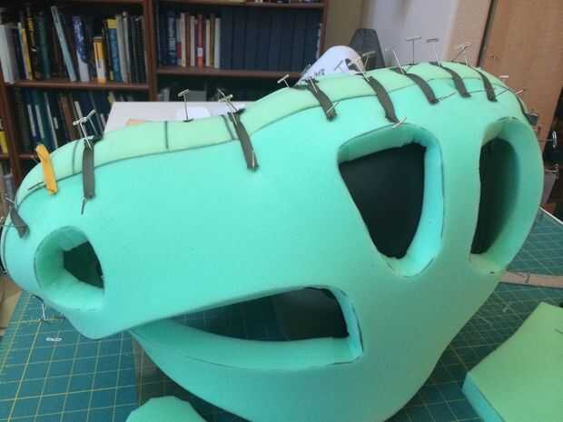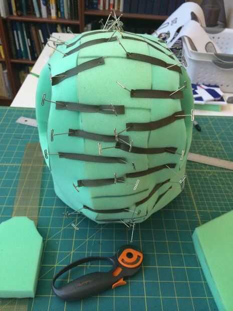 Tomamos los planes modelo como base para la cabeza sin embargo. tomamos el papel y envuelto alrededor de un casco de bicicleta. Esto nos permitió ver cómo teníamos que modificar el patrón para conseguir que se ajuste. Luego transfiere el patrón a 1" de verde espuma y pegué con Fabri-Tac.