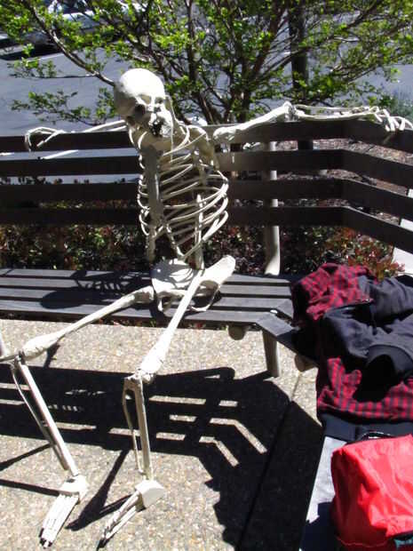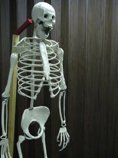 La pelvis y las costillas me dieron la mayoría de problemas, pero finalmente construyó era hacer la forma de alambre, luego reforzar con alambre de pollo, luego cubrir de cinta aislante y papel maché.