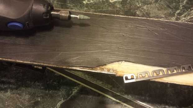 Recortado los bordes para obtener una buena superficie de juego. La toma fue cincelada limpio para obtener una buena interfaz para epoxi. Los bordes quedaron más de la toma porque tenía originalmente la intención de la soldadura en. Funcionaba hacia fuera.
