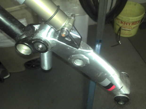 Propuso volver a la caja del pedalier de la bicicleta de los niños como el pivote principal y la cañería abajo tubo (volteado boca abajo) como el nuevo basculante.