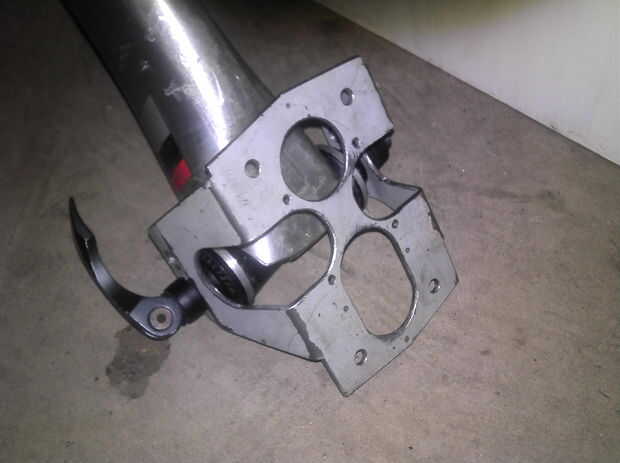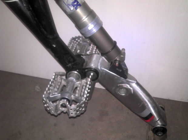 Las plataformas de pie está hechos de un par de viejos pedales 'trampa de oso', unos tubos para que quepa el soporte inferior y un viejo cuesta abajo a través de ejes para garantizar todo.